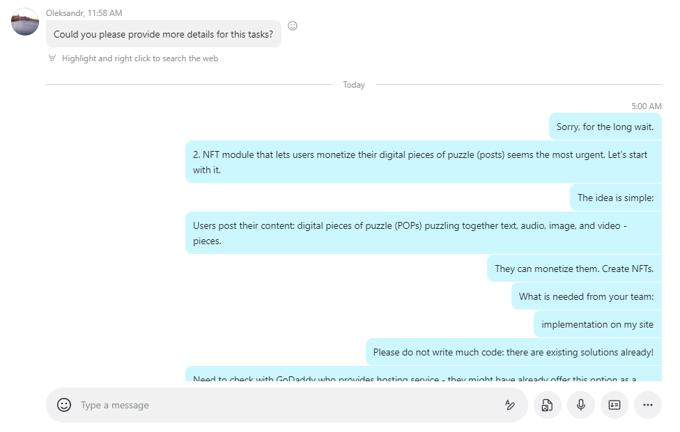 5:00 AM Sorry, for the long wait. 2. NFT module that lets users monetize their digital pieces of puzzle (posts) seems the most urgent. Let's start with it. The idea is simple: Users post their content: digital pieces of puzzle (POPs) puzzling together text, audio, image, and video -pieces. They can monetize them. Create NFTs. What is needed from your team: implementation on my site Please do not write much code: there are existing solutions already! Need to check with GoDaddy who provides hosting service - they might have already offer this option as a paid service 6:08 AM For example, here is a link to a POP with this very chat. 3. Dr. Z knew that the chances anyone from the people presently living in this world (Present People -PPs) will try to figure out who is K and what this is all about are less than slim. Still, he believed that future people (FPs) will appreciate this very piece of puzzle (POP) that will let them to train their Artificial Intelligence (AI) models. The current generative AI is in its infancy. Still, it already made a huge jump just in the last year. These future people will not have a choice - they will have to develop models of reality to choose the Optimal Path of Evolution. One day, a 6th grade student from that future with a name, for example, Little Bobby might will get an assignment to solve this very situation from the past: figure out this specific situation by playing 20 Questions game with his computer. 4. "Oh, boy, Dr. Z" He will say. "This problem is not a problem at all - my ChatGPT-XXIV can solve situations much more complex. I just wonder if it's a coincidence that you guessed my name correctly?" Dr. Z played in his imagination for the imaginary boy from the future. His neobuzdannoe (Russian for wild) imagination was ready to prugnut' (jump) through the Space-Time-Mind (STM)-continuum to that future where there will not be any wars and suffering because razum (mind) pobedit (overcome). Well, he had to keep his wild imagination on a short leash - this POP was already too long! 5. "That's all folks! Tochka (Russian for period - meaning the end)" He decided. "Hopefully, K will see how this Everyday Life Game works. It would be great if she could rate it - to see how her perception stacks against average. It would be amazing, if she could offer improvements, but that might be too much to ask! Hopefully, this recording of the chat will be helpful even though it does not have too many Dr. Z's comments."