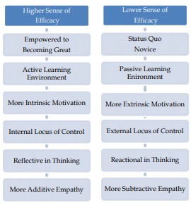 Great teachers believe strongly in their instructional sense of efficacy (through self-examination); therefore, they are more likely to create worthwhile experiences for their students, while teachers with a lower sense of efficacy are more likely to view teaching as a mechanical process. For instance, these teachers generally rely too heavily on external props, such as PowerPoint slides (provided by the publisher of the text) to teach.36 This pattern indirectly reinforces the atypical belief that students are passive recipients who “absorb information.” They also tend to believe and act on the notion that they can only teach if they had the right type of student, reflecting an external locus of control. It is important to note, that, novice (who may or may not be new) teachers without teaching experience, may start their career with a lower sense of efficacy because they have not had an opportunity to learn how to engage in reflective thinking. To this end, the point of this section is to differentiate certain aspects between higher and lower sense of efficacy teachers so you are better prepared to foster a higher sense of efficacy quicker. This way you know what to look for when you engage in your new career. |