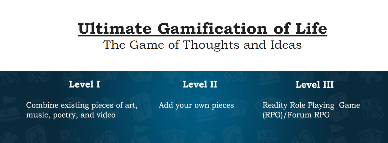 The crowdsourcing-crowdfunding-crowdgaming Web-based platform has been under development since 2007. It was originated by Dr. Michael Zelin as self-developing (users post content), self-improving (users offer improvements to each other posts), self-rewarding (users can receive sponsored rewards) life gamification system. The object of the game is to achieve the highest score and advance to the Magister Ludi level. The goal of the game: meaningful enjoyment & personal growth and self-improvement. The Game can be played on three levels: Level I - players combine (puzzle together) existing pieces of text, audio, image, and videos; Level II - add own pieces; Level III - Reality Role Playing Game (RPG). Players can incorporate typical RPG elements: choose an Avatar, start at the Apprentice level and advance through the ranks to the Master, Grand Master, etc. levels based on the rating of their creations and real life actions. Special rating scale enables rating of every component of created pieces of puzzle (POPs) as well as people’s actions in real life based on recorded audio and video-files. For example, users can receive Creativity, Honesty, Open Mindedness, Readiness to Try New, and other points. Users can create Life Road by creating dots and posting their pictures, videos, stories about related experiences. Users can link dots on their Life Road with those of their friends. They can form teams and document their missions in a form of multimedia stories. As in typical RPG Forums, they can develop one of the central storylines (threads) or start a new thread. For example, according to one current central storyline, players of the Game of Ideas help to save the World. In the future, people will develop simulations of reality. They will simulate their past - current present - to calibrate and validate their models. People who capture reality in their multimedia posts help them to do so. Players can play for a Good Team, a team of good people and good machines, and a Bad Team, a team of bad people and bad machines. Similarly to a military game, this a friendly contest helping each team to achieve their goals, one of which is to develop the most realisting simulation of reality. Players can receive real life rewards: sponsored products and financial support. Sponsors providing support can save on online advertising and showcase good-cause projects that they support. Accumulating good points, players can advance to Rest Areas and Happy Places - get discounted or free stay at hotels, resorts, cruises, etc. To prevent/punish negative behaviors, there are Gallery of Unfair Players, e-Jail, and e-Inferno (Enferno) designed after classical Dante’s model in nine circles. In January, 2022, the Web hosting provider caused loss of all content built in previous years of development. Thousands of galleries, user created posts, and gaming resources were lost. Recent efforts are directed at re-building the platform.